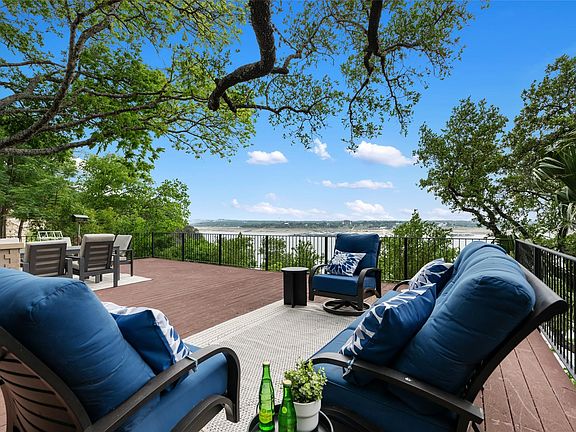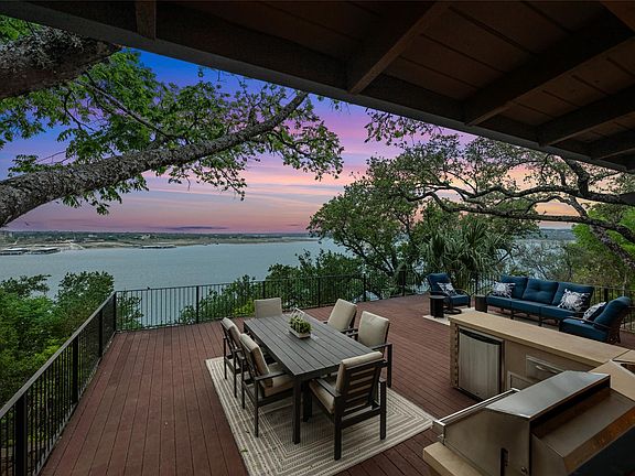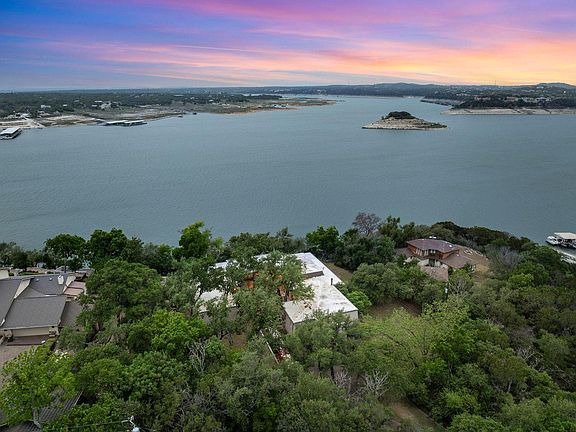Prepare to be captivated by this beautiful Volente estate. On the deep water main body portion of Lake Travis, this one-of-a-kind property has walls of windows spanning the back of the home capturing breathtaking lake and hill country views. Situated on 1.34 acres of sprawling green, lush lawns draped with shade trees, this enchanting, timeless home was completely updated with designer interior selections throughout and welcomes bountiful gatherings and peaceful seclusion. Desirable peninsula location showcases this stunning home and grounds with a swim-up dock. Enjoy 180-degree views for miles from the wrap-around, deep covered back and side porches. Large composite deck equipped with outdoor kitchen perfect for entertaining a crowd. A cozy, built-in fire pit completes the ambiance. Your amazing courtyard, with double iron gates, ample seating area and a calming fountain with flower beds ushers you inside the extraordinary residence. Clerestory windows wrap the entry, kitchen, and dining at the top of the high ceilings bathing the home in natural light. The gourmet kitchen has views of the lake as well as the courtyard. Equipped with a large island, custom walk-in pantry, bountiful storage, a casual dining area, and a large formal dining area, entertaining is a breeze. The Primary suite is tucked away on its own wing for complete privacy boasting incredible views, fireplace, beautiful bath, separate vanities, walk-in shower with view of Zen garden, and huge walk-in closet containing built-ins to keep you organized. Private office off the primary bedroom also has amazing views of the lake and fabulous built-ins. Spacious main living area with high ceiling and fabulous views, cozy gas fireplace, large stone hearth, plus a bar tucked around the corner. The secondary bedrooms with en suite baths are smartly located on their own wing with their own living area. This home is truly mesmerizing, comfortable and so inviting that you'll never want to leave.