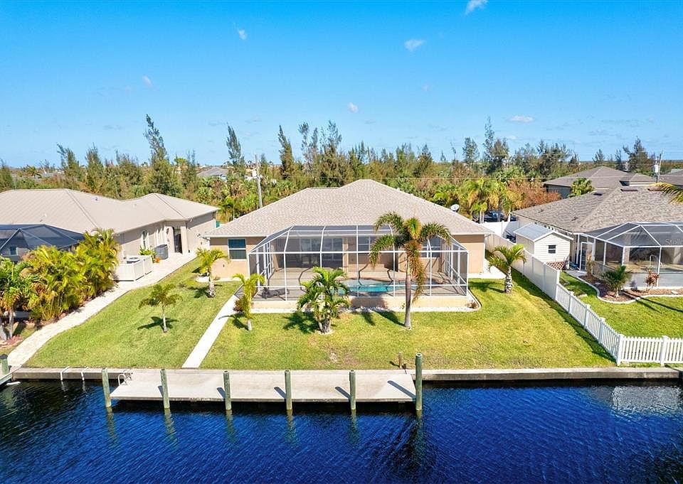 ANOTHER DRASTIC PRICE REDUCTION!!! ***SELLER SAYS TO SELL THIS HOUSE!*** Experience waterfront living at its finest in this stunning South Gulf Cove pool home! With SELLER FINANCING AVAILABLE WITH A LOW INTEREST RATE FOR QUALIFIED BUYERS, Voluntary HOA fees, and NO CDD, this beautiful turnkey 3-bedroom home, plus den/office or 4th bedroom with closet, 2.5 bathrooms, and 3-car garage, offers a seamless blend of luxury and comfort. Step inside and be welcomed by an array of thoughtful upgrades and modern conveniences designed to complement the relaxed Florida lifestyle. The open-concept kitchen features a breakfast bar, pendant lighting, an eat-in dining area, and a walk-in pantry, while the indoor laundry room includes custom cabinets and granite counters. Separate Dining off the Living Room offers a more formal space for dining. The primary suite offers water and pool views and has access to the lanai, plus dual walk-in closets. The Owner's walk-in closet has a keypad for your personal things and your valuables. The primary bath features dual sinks, a soaking tub, and a large shower with a shower seat and dual shower heads. Elegant touches abound, from the soft-close cabinetry and granite countertops throughout to the double tray ceiling in the living room and tray ceiling in the primary bedroom. Volume Ceilings give this home an open feel. The energy-efficient spray foam insulation enhances interior comfort throughout the home. Best of all, enjoy breathtaking water views from the Living Room and Dining area that open to the covered lanai and heated pool, where you can watch the boats go by, making it the perfect space for indoor-outdoor living. New Roof 12/2022 has a 15-year transferable warranty, offering lasting peace of mind. The Southern-exposure heated pool, adorned with Shell stone pavers, consists of a child-safe door alarm and solar cover. This outdoor oasis is ideal for entertaining or unwinding, featuring an outdoor shower and a full-yard irrigation system, including a new pump installed on 2/25. Inside and out, the home boasts a range of features. Hurricane safety is ensured with electric storm catcher shades for the lanai, impact-resistant windows throughout + Zero Corner PGT IMPACT 90 DEGREE SLIDERS. This home truly shines in its waterfront appeal with 80ft of concrete seawall and a 40 ft concrete dock equipped with water, electricity, and a ladder. The pool’s sun shelf and the serene waterfall feature add to the appeal. With easy access to the boat lock system, you can take your boat out and be on your way to the Gulf in minutes to enjoy fishing or trips for lunch, Boca Grande, or Stump Pass to meet up with friends and family. If you don't feel like taking the boat out, take a ride to the Gulf beaches - Englewood Beach/Venice Beach/Siesta Key, and more. You can also enjoy dining and shopping, all nearby. Watch the Tampa Bay Rays for Spring Training at the state-of-the-art ballpark, Charlotte Sports Park is just 15 minutes away. Golf lovers, there are public courses and a driving range nearby, plus 49 other courses within 20 miles. Visit historic St. Armands Circle in Sarasota for the day, browsing in boutiques, visiting art galleries, and exploring the fantastic restaurants in the area. This home offers the ultimate Florida lifestyle. Schedule your private tour today and make this waterfront paradise yours! Furniture is Optional. Plans from the builder - Capitol Homes - will be included. Make it yours and make an offer!