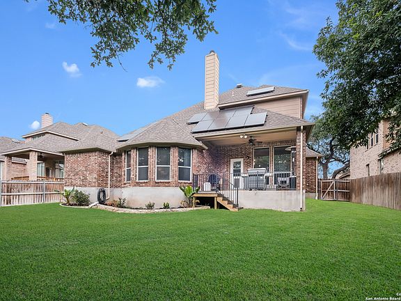 This exceptional Highland beauty is located in sought-after gated community of Sonoma Ranch, Helotes TX. Light, airy, and clean with a well though out floor plan and high ceilings - ready for the next owner to continue the TLC the current owner has given. All 4 bedrooms are downstairs, game room and media rooms are upstairs. Separate private study, open spacious Island kitchen with gorgeous solid countertops provide plenty of food prep options and gas cooking. Easy to entertain or visit with this open gourmet kitchen to family room. Family room has attractive fireplace for those cooler Texas evenings. Downstairs master retreat has curved wall windows giving extra living space/sitting area. 3 additional bedrooms are down, one bedroom has it's own bath. Loads of storage. Upstairs enjoy spacious game room AND home theatre with ample seating area. Attractive scrapped wood floors and carpet throughout. A good size patio out back is perfect for the BBQ's! Well kept lawn and backyard with serene greenbelt ensure the privacy you've been looking for. Gated, community pool, exceptional Northside schools, easy access to highways, close by restaurants, shops and universities. A few improvements include: 3.2024 interior paint, all new doors and hardware, new quartz countertops in downstairs and master bathrooms, new dishwasher, 3.2021 new A/C systems replaced with Trane and whole house air filters, 2018, 48 panel solar system by Wells Solar, and Dual tank water filtration and softener in stalled. 2014, Roof replace due to hail. Come see this meticulously cared for home and discover why Sonoma Ranch is a great place to live.