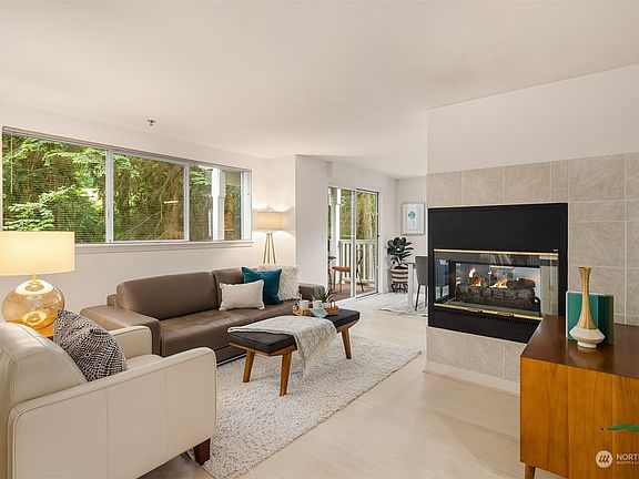 Spacious and Sublime in Inglemoor... Backing to a lush golf course greenway with a babbling brook, this one level condo features a zero stair entry and 1400+ sq ft of bright and freshly updated living spaces. Contemporary styling inside and out with a modern glass fireplace shared by the living and dining rooms, a gleaming quartz and stainless kitchen and an inviting family room so perfect for movie nights or extra work from home space. The primary suite has an elegant french door entry and luxe bath with a walk-in shower. Another bedroom, full bath and utility room complete the perfect, easy living floor plan. Enjoy evenings on your private deck or explore nearby St. Edwards Park. Individual garage parking, close to everything Eastside!