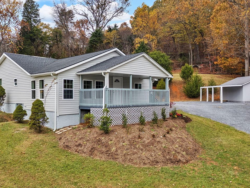 Nearly everything you see is new — but it's the kitchen & bathrooms that steal the show. The kitchen opens effortlessly to the living room, creating that open, connected feel everyone wants. With new cabinets, laminate countertops, and a deep stainless sink under recessed lighting, it's easy to picture morning coffee here or dinner with friends flowing straight into the living space. Both bathrooms have been completely reimagined with new vanities, toilets, showers, & fixtures — every detail chosen to make daily routines feel a little more like self-care. Behind the scenes, the work that matters most has been done, too: new HVAC heat pump, PEX plumbing, electrical system, insulation, & lighting throughout, with much of the framing newly rebuilt & fresh paint tying it all together. New windows. New interior doors. Step outside of the new exterior doors, & the improvements continue. New gutters & updated siding frame the exterior, while a 2020 roof (per previous owner) adds peace of mind for years to come. The septic tank was pumped in 2025 as well. The property includes a substantial storage barn — ideal for tools, hobbies, or creative workspace — & a brand-new gravel driveway that winds gently up the hill to a level parking area. From there, the covered front porch gives you just enough elevation to take in the quiet country views — a perfect place for a pair of rocking chairs & a slower start to your mornings. New landscaping completes the setting, giving this nearly one-acre property (.99 of an acre, to be exact) the finishing touches it deserves.