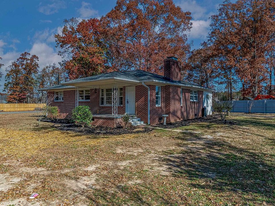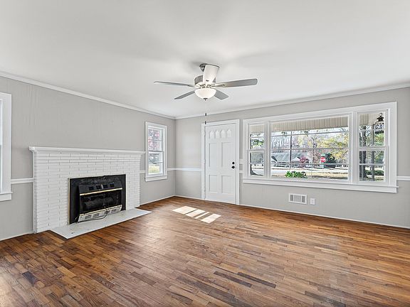 Painted masonry fireplaceClassic brick ranchGenerous half-acre corner lotSpacious family roomOriginal hardwoodsThree bedroomsOpen kitchen and dining