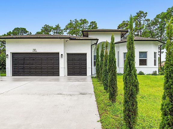 CONSTRUCTED IN 2023***IMPACT GLASS***SOLAR PANELS***CITY WATER***3 CAR GARAGE***NO HOA***CONTEMPORARY DESIGN***1.62 ACRE LOT****Prepare to be impressed. A 2023 ultra modern show stopper blends luxury, security and a convenient location and is perfectly positioned on a professionally landscaped corner lot. Step inside to discover this highly sought after open, light-filled floor plan where 12 foot ceilings and elegant flooring create an immediate sense of contemporary grandeur. The heart of the home is a chef's dream, featuring top-of-the-line stainless steel appliances, separate oven, exquisite quartz countertops and custom designed cabinetry accented with sophisticated LED lighting. Entertain effortlessly in the great room, anchored by a stylish decorative fireplace that adds a touch of elegance. Your private retreat awaits in the master suite, boasting dual sinks, freestanding Roman tub, separate shower and a huge walk-in closet designed to amaze. The home is engineered with hurricane impact windows for security, solar panels for energy efficiency and it meets all of Florida's latest building codes. Unique to this model, the second bedroom is also an ensuite. Outside your personal paradise awaits. Enjoy endless evenings in the screened Gazebo, gather around the Fire Pit and relish the unparalleled space and privacy. Embrace the convenience of a location close to Northlake Blvd, placing you less than 2 miles from every essential amenity, including shopping, eateries and medical facilities (see photos). NO HOA and public water, which is a rare find in this area. This move-in-ready home is waiting to be experienced...schedule your tour today. Financing incentives are available on all properties from SIRVA Mortgage, Inc.