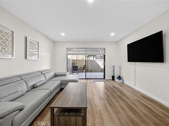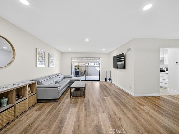 Welcome to this beautifully updated downstairs unit with no steps, located in the highly desirable La Mirada Landmark 55+ community. This bright and airy 2 bedroom, 2 bathroom condo features luxury vinyl flooring, fresh paint, recessed lighting, and dual-pane windows that create a modern and inviting atmosphere. The spacious living room opens to a private patio with newer tile, perfect for outdoor relaxation. The remodeled kitchen showcases sleek quartz countertops, while both bathrooms have also been tastefully updated. Ample storage is provided with large closets, and the convenience of having the 1-car garage nearby (Garage 3P1 #4) and plenty of community parking adds to the home’s appeal. Perched at the highest point of Landmark, enjoy a serene setting within a guard-gated community offering 24/7 security patrols, resort-style amenities including a pool, spa, tennis and pickleball courts, fitness room, clubhouse, and scenic walking trails. Located across from the La Mirada Golf Course and near the H-Mart shopping center, this property combines serene living with convenience and offers the perfect blend of comfort, security, and an active lifestyle.