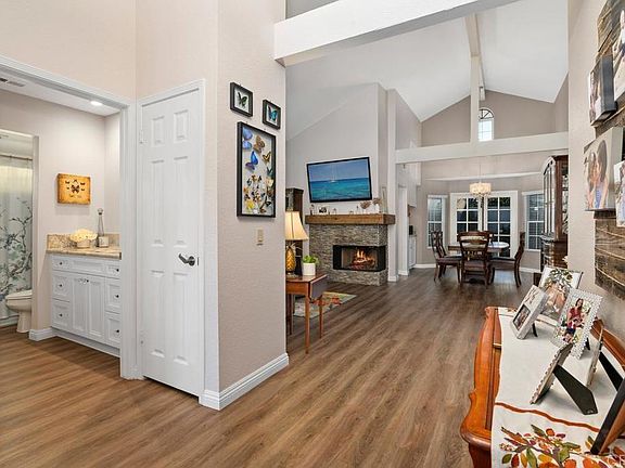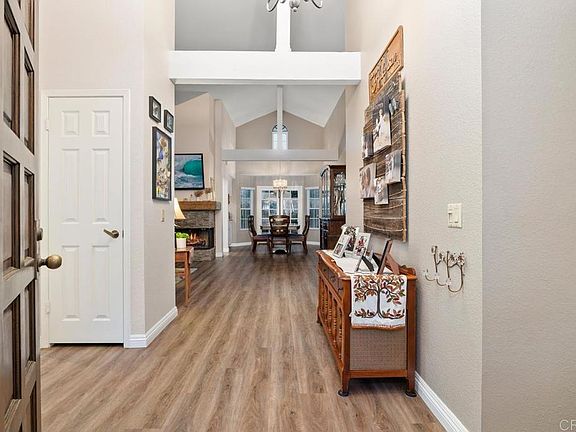 Nestled in the highly sought-after community of Las Brisas, this is a gem in the heart of Poway's renowned school district. Two large bedrooms, two updated baths, and a private attached garage. Boasting the convenience of single-level living, it offers the spaciousness and comfort of a single-family home. With both front and back yard spaces, you'll have ample room for indoor/outdoor living enjoyment in this quiet neighborhood. This home stands out for its unique feature - no one above or below, and only sharing one wall (end unit), ensuring a peaceful and private living experience. Designer features include contemporary kitchen with breakfast nook for casual eating, white cabinets, granite counters (beveled edge), stainless appliances and an open counter pass through to the large elegant dining room. The floor plan is open with vaulted beamed ceilings, plenty of natural light and windows and French doors. Large primary room with his and hers closets and double sink vanity, beautiful flooring throughout and a gorgeous two sided fireplace with custom wood mantel. Back yard is private with terraced rose garden, pebbled path, and gorgeous tropical Palm. A great space for relaxing and enjoying the California Lifestyle. Plus, the HOA amenities are a true bonus, including access to the clubhouse, a refreshing pool, and the delightful playground. For even more recreational options, the Bernardo Heights Community Center offers tennis courts, an additional pool, a spa, a fitness center, and a wealth of other community facilities. This is an exceptional opportunity to enjoy a serene lifestyle in a coveted location.