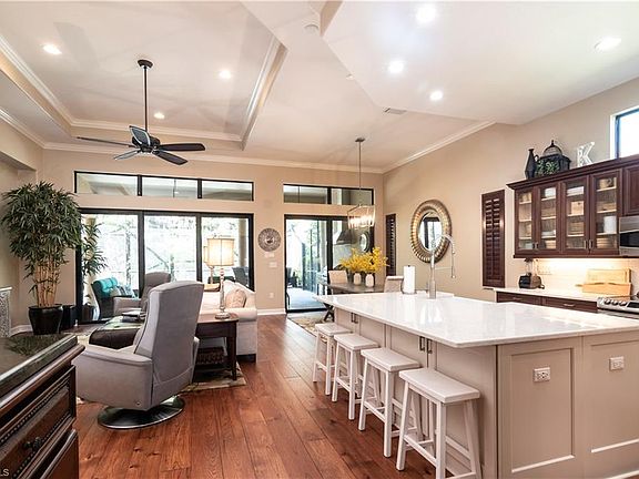 WOW! Every detail, top to bottom, has been upgraded in this 3 bed, 2 bath, San Remo III pool home. First impressions are everything with lush landscaping leading to the gorgeous high-impact iron and glass front door. The home opens to soaring 12 ft cove ceilings, transom windows for cascading natural light, extra canned ceiling lights, new light fixtures and fans, crown molding, plantation shutters, and an inviting West facing view of the pool and outdoor living space. Sunsets every night are the perfect backdrop to an open floor plan where entertaining is effortless between indoor and outdoor spaces. Totally renovated kitchen, one-level island with extra storage and pullouts, quartz countertops, newer appliances including a double oven, and built-in pantry shelving. Enjoy the best of alfresco living in a brand new outdoor kitchen with gas grill and exhaust hood, leaving nothing to be desired for your family grill master. Engineered wide plank wood flooring throughout, all high-impact windows and doors, renovated bathrooms with quartz counters, stunning walk-in shower in master bath, along with two vanities and extra cabinets. No shortage of storage space with additional closets created in hallway, laundry room, and office. Six feet of additional deep garage space with epoxy flooring, plus a finished floor in attic for even more storage. A very private and quiet neighborhood with low fees in North Naples! Close to everything. A must see community and home that will impress you at every turn. Luxury is in the details and this home has it all!