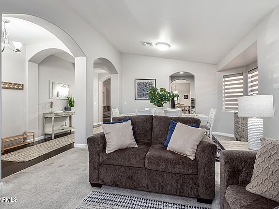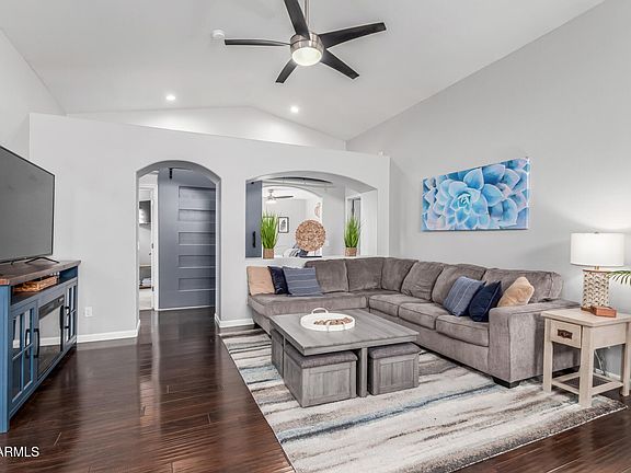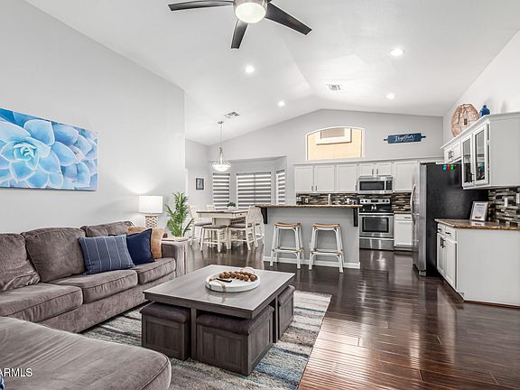 Charming 3-bedroom home with a 2-car garage, RV gate & excellent curb appeal! The interior boasts abundant natural light, a neutral palette, vaulted ceilings, & a mix of tile, carpet, & wood-look flooring throughout. The inviting living room is perfect for entertaining guests. The spacious great room features an open floor plan. The kitchen includes ample white cabinets, a tile backsplash, granite counters, SS appliances, an island & a breakfast bar, & direct access to the backyard. The large main bedroom hosts a private bathroom w/ dual sinks, a separate tub/shower & a walk-in closet. Contemplate in the backyard! With a sparkling pool, and relaxing hot tub, covered patio, & shaded trees, ideal for gatherings. This home is waiting for you!