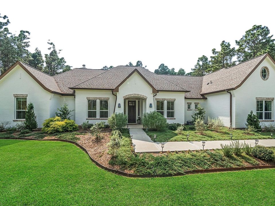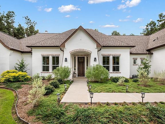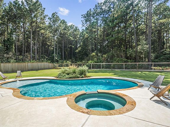 Private backyard oasis with a sparkling saltwater pool & spa, lush Zoysia lawn & a covered lanai for year-round enjoyment. This timeless farmhouse with European charm by Royal Texan Homes sits on 2 premium acres in Republic Grand Ranch, just minutes from The Woodlands. Magazine-worthy design filled with high end upgrades including white oak floors, custom cabinetry, black granite countertops, antique brass accents, and a statement fireplace. The chef’s kitchen offers a white oak island, marble backsplash, and a spacious walk-in pantry. The well-planned layout includes 3 bedrooms, 3.5 baths, plus an upstairs game/media lounge or optional 4th bedroom with full bath. The luxurious primary suite boasts dual custom vanities, antique fixtures, a soaking tub, a glass-enclosed shower & designer tile. Additional highlights include an air-conditioned 3-car garage, whole-home dehumidifier, & access to community hiking trails & a fishing pond. A rare blend of elegance, comfort & outdoor living.