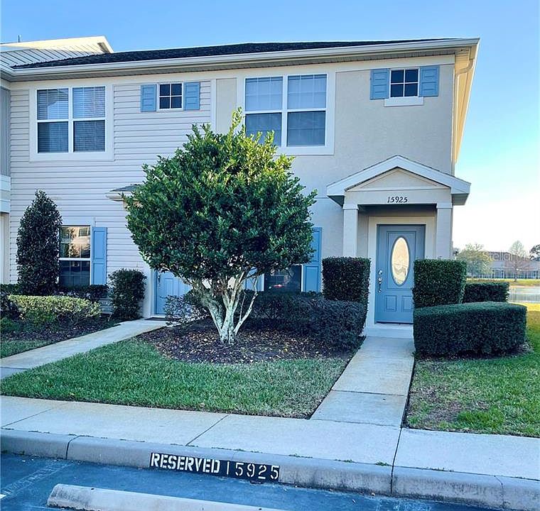 The Lancaster, a former model townhome with many upgrades. This beautiful end unit features concrete block construction, 2 bedrooms with private baths upstairs and 1/2 bath on first floor. The kitchen has stainless steel appliances, built-in microwave and dishwasher, beautiful wood cabinets with crown molding, Corian countertops and durable ceramic floor. Crown molding, intercom system, security system. Dimmer switches in all bedrooms and kitchen. Newly painted and new carpeting in 2021! New HVAC June 2019, New Microwave July 2017. This model home also has a beautiful screened-in porch overlooking a pond. This gated community offers its residents full lawn service maintenance and a swimming pool. The reasonable HOA fee includes reserves for exterior painting, roofing, and private streets. Conveniently located next to the Suncoast Parkway and HWY 52. Agent related to owner.