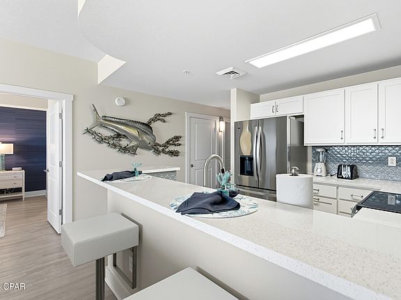 Floor-to-ceiling glass doors fill the open-concept kitchen and living area with natural light and lead to a spacious, rounded 10-ft balcony - one of the largest in PCB - perfect for sunset watching or enjoying morning coffee above the surf. Inside, EVP flooring runs throughout for effortless upkeep and lasting style. The modern kitchen features quartz countertops, a scalloped tile backsplash, and stainless appliances. A custom coral reef mural in the living area adds a touch of playful coastal character. The Gulf-view primary suite also features a sliding glass door that opens directly to the balcony. Both bathrooms have updated walk-in showers. Previously owner-occupied and meticulously maintained, this condo is offered fully furnished with tasteful coastal décor and is ready for rental or personal use.
