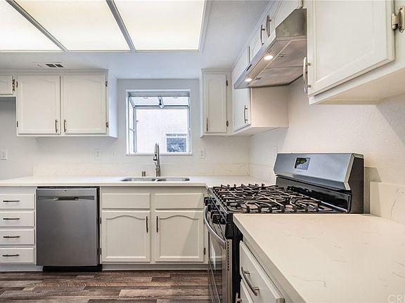 Newly renovated end unit townhome in gated complex featuring 3 bedrooms and 2.5 bathrooms with ample windows and light. Enter into the living area with a fireplace and new laminate wood-style flooring. Remodeled kitchen has new quartz countertops, cabinetry hardware and stainless steel appliances. Updated bathrooms have new tile flooring and vanities. Master bedroom features a walk-in closet and private bath. Bedrooms have cathedral ceilings. Mirrored wardrobes. New interior paint. Cozy patio area accessible from the living area. Convenient in-unit washer and dryer and two car garage with direct access. Won't last long - be sure to check out our virtual tour!