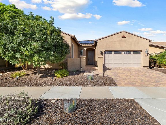 Greer Ranch North - Exceptional Single-Story Residence - ''Indulge'' Model describes the greatness of the features this home has to offer! This property offers four bedrooms and three bathrooms, featuring a thoughtfully designed courtyard and fully paid solar system, resulting in zero electric bills. Exterior - The driveway is finished with pavers that continue through the courtyard to the covered entry. The backyard showcases lush landscaping and a covered patio with pavers, providing an inviting outdoor space. Interior - Tasteful plank tile flooring extends throughout the home, complemented by creative flooring designs in the bedrooms. The residence boasts 10-foot ceilings, light designer paint, recessed lighting, a whole house water filtration system, PAID SOLAR, & gas water heater. Entryway features include a solar lite. Designed for flexible living arrangements and guests, the floor plan consists of three distinct areas: a primary bedroom suite, a guest room with a private bathroom, and two additional bedrooms with a hall bathroom. Each area includes built-in cabinetry for ample storage, allowing for versatility between flex spaces and traditional bedrooms. Kitchen - The kitchen is appointed with a spacious island offering extensive counter space topped with smooth quartz and accented by colored glass subway tiles. High-end cabinetry and a pantry complement the stainless-steel appliances, which include a microwave and oven combination, gas cooktop with downdraft venting, and a breakfast bar integrated into the stylish kitchen islandideal for entertaining. The primary bedroom is generously sized, featuring a walk-in closet and a bathroom with dual sinks, long quartz counters, and a spa-like walk-in shower. The open-concept great room seamlessly combines living, dining, and kitchen areas. An interior laundry room located off the garage accommodates washer/dryer. The 2-car garage provides extra space in back of garage for suitable for a potential tandem car setup.