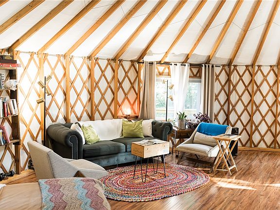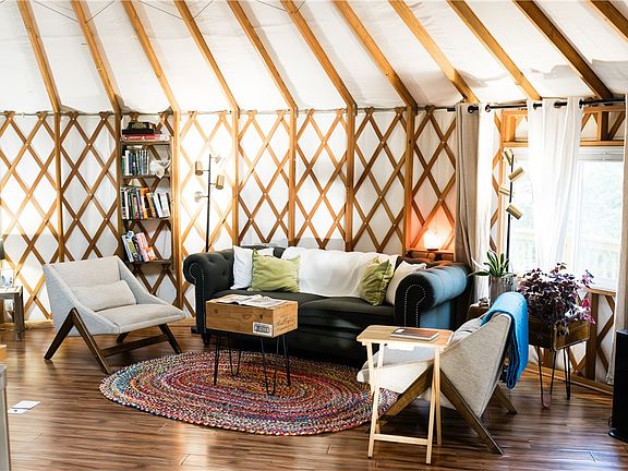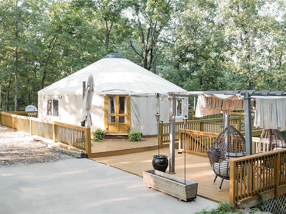 Amazing retreat or investment/income property! This 30 ft Pacific Yurt boasts a brand-new premium vinyl tarp and side cover designed to last 20 years, plus top upgrades- wind/snow protection, UV dome, energy-efficient windows, and a gourmet kitchen with refrigerator, dishwasher, and disposal. Enjoy 7 decks, 2 water features, 2 fire pits, and a pre-wired hot tub pad. Separate RV pad with electric, septic, and water. Backs to Devil's Eyebrow habitat, minutes to Beaver Lake, Rogers & Eureka. Featured in Citiscapes 2022-truly one of a kind! Comes fully furnished - egg chairs outside and the Kucht range do not convey. Property will not go secondary market financing. The property is currently on AirBNB with some booked weekends through October. Bookings do convey with the property or can be canceled.