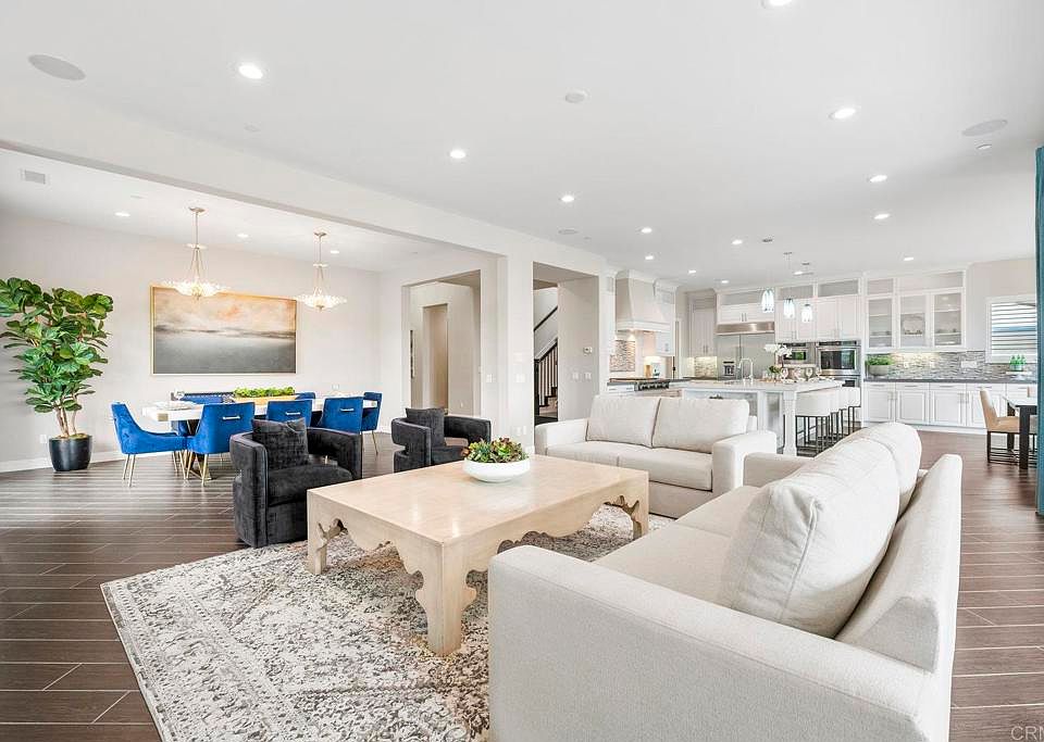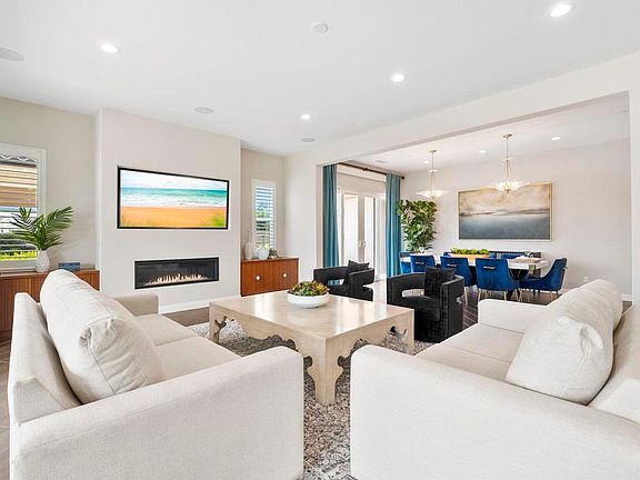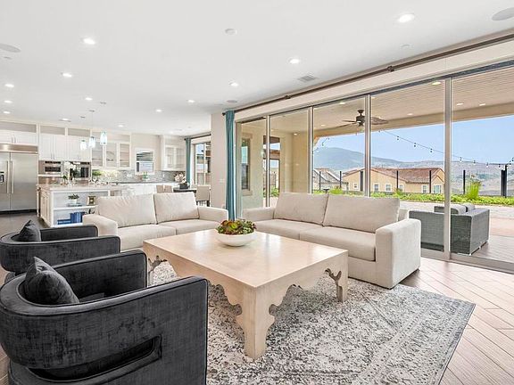 Welcome to this stunning Avondale Plan 1 home in the highly sought-after Del Sur community, perfectly designed for modern living and entertaining. Set on a quarter-acre lot, the home offers 4 bedrooms, 4.5 baths, and a spacious loft, with unobstructed panoramic views of the canyon and Black Mountain. A two-story foyer welcomes you into the bright, open floor plan, where natural light fills the living spaces and custom shades add a refined touch throughout. The kitchen is both stylish and functional, featuring white cabinetry, an oversized quartz island, grey quartz countertops, marble backsplash, seeded glass cabinets, built-in refrigerator, double oven, and a large walk-in pantry. The dining room overlooks the outdoor patio and fountain, while the great room with fireplace and built-ins opens to the California room with motorized screens, creating seamless indoor-outdoor living. Downstairs also includes a full bedroom and bath, ideal for guests or multigenerational living, plus a convenient powder room. Upstairs, the loft with built-in cabinets and island is a perfect home office or craft space. The primary suite features a private deck with sweeping canyon and Black Mountain views, and the en suite bath offers white cabinetry, dual sinks, soaking tub, separate shower, and a walk-in closet with built-ins. Two additional upstairs bedrooms each have private baths, with one including a walk-in closet. The backyard is an entertainer’s dream, with a built-in fire pit with seating, water feature, pergola with outdoor kitchen, bar seating, and dining area. Drought-tolerant landscaping with succulents creates a serene, low-maintenance setting. Additional highlights include a three-car garage with epoxy flooring, Life Source water filtration system, and owned solar. Peaceful, private, and full of light, this home offers the perfect combination of comfort, style, and breathtaking views. With no direct neighbors behind, the property captures captivating views of Black Mountain. Don’t miss your chance to own in Del Sur—the ultimate choice for family-friendly living. Enjoy award-winning PUSD schools, 14 parks and 11 pools exclusively for residents, miles of hiking trails, community events year-round, and convenient shopping. This location is within easy driving distance to the Del Sur town center for Sprouts Farmers Market, Target, Starbucks, restaurants, fitness clubs, and more.