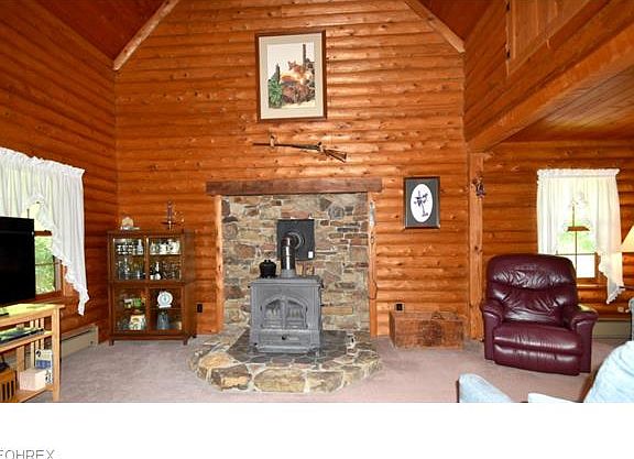 Your private hideaway! Stunning custom built Thermo Log home on gorgeous secluded 5+ acre lot! Attention to detail & exemplary craftsmanship. "Thermo Log" i2 2x6 construction w/6" insulation. 1/2 log on outside, 1/2 log on inside. First level features very spacious eat-in kitchen w/ rough hewn beams, custom cupboards, plenty of counter space,open to great room w/vaulted ceiling, bay window, skylights & stone hearth w/woodburner. Kitchen access to covered porch overlooking serene countryside. Master bathroom w/ dbl closets access to full bath & steps away from another covered porch. Dramatic spiral staircase to second lvl w/2nd bedroom also featuring vaulted ceiling, full bath, & loft overlooking the 1st level. Loft is gorgeous. Another vaulted ceiling w/ skylight & can be converted to 3rd bedroom. Take the staircase down to the walk out basement! Huge workshop w/cupboards, laundry room & rec room. Front portion of roof reshingled '09, rear portion complete tear off '09. Huge 40x30 garage/outbuilding has separate workshop w/skylights, furnace, & storage galore! Septic passed county inspection May '15.