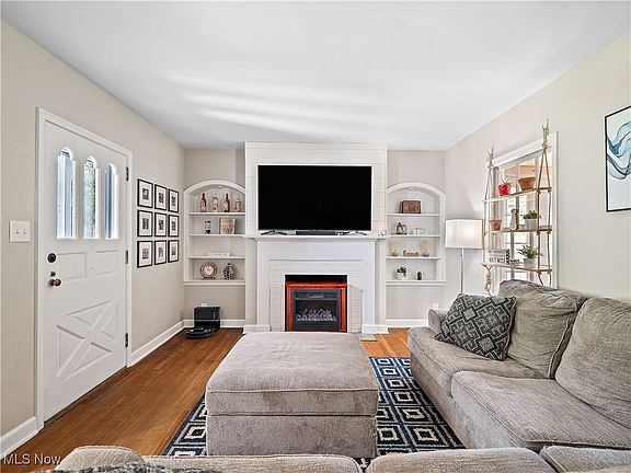 Step inside to discover a remodeled galley-style kitchen, featuring stainless steel appliances, a deep farmhouse sink, and vinyl plank flooring, perfect for today’s home chef. The formal dining room seamlessly transitions into the cozy living room, featuring hardwood floors, custom shiplap above the fireplace, and built-in shelving that adds warmth and functionality.