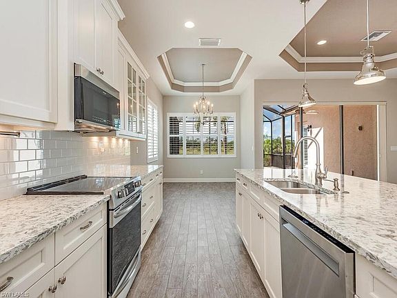 Upon entering the soaring entry to this coastal contemporary style home, you will be impressed by the volume ceilings offering 11-foot tray accents. Property features many high-end details throughout, including crown moldings, plantation shutters, and stunning wood-look tile flooring. An open floor plan is centered around a spacious great room, dining area, and an impressive kitchen with white Shaker style cabinets, upgraded appliances, a walk-in pantry and a large island with beautiful Quartz countertops. This home is made for entertaining! The split floor plan includes 4 full bedrooms and 3 baths, or 3 full bedrooms with the option of a study-home office. The luxurious primary suite includes a spacious bath with 2 walk-in closets, dual sinks, a large soaking tub and separate shower. Step outside to enjoy the large outdoor screened paver deck patio overlooking the private preserve with the much-desired southern exposure for warm winter days of enjoyment! You’re sure to enjoy this well-designed home in the centrally located, gated community of Andalucia. The community offers a beautiful pool, spa-hot tub, exercise room, basketball, and child play area. Property is located a short distance to restaurants, shopping, and only an approximate 15 minutes to the gorgeous Naples beaches