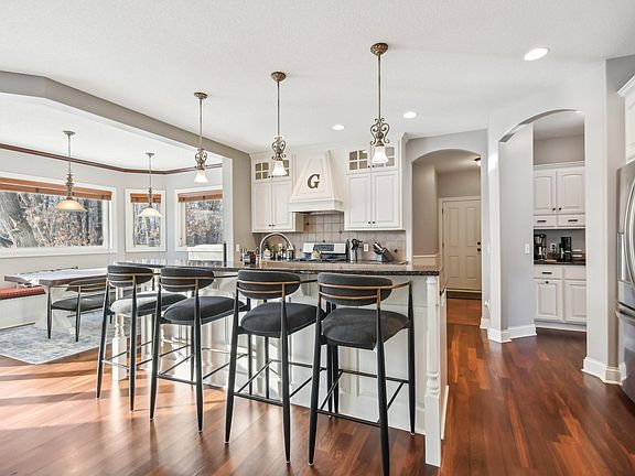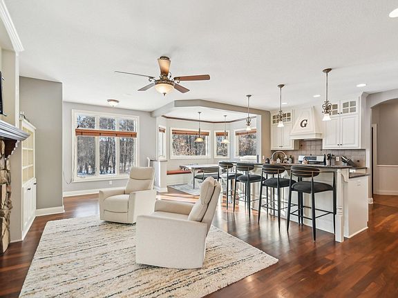 This beautiful Ham Lake home has it all—charm, space (over 5,100 finished sq ft), and a stunning setting. With great curb appeal and lush landscaping on a sprawling 1.62 acre lot, it welcomes you with a grand entry featuring cherry hardwood flooring. The open floor plan is designed for both comfort and entertaining, with custom built-ins, formal and informal dining spaces, and a cozy hearth room. The updated gourmet kitchen boasts granite countertops and extended cabinetry, perfect for a coffee bar, all while offering incredible views of the immaculate backyard. The main level also includes an executive office and a flex room for added versatility. Upstairs, you'll find four spacious bedrooms, including a primary suite with a fireplace, sitting area, and a luxurious five-piece ensuite. A huge bonus room offers endless possibilities for a media room, home office, or playroom. The finished walkout basement is an entertainer’s dream, complete with wine cellar, a wet bar, additional bedroom and bathroom, and a spacious family room (extra cozy with radiant floor heat too!). Step outside to enjoy two private decks, a large patio, and a custom radiant heated 4-car garage (well over 900 sq ft) with plenty of storage, floor drain, diamond plate protected walls, and even hot/cold water! New roof August 2024! This is one you won’t want to miss!
