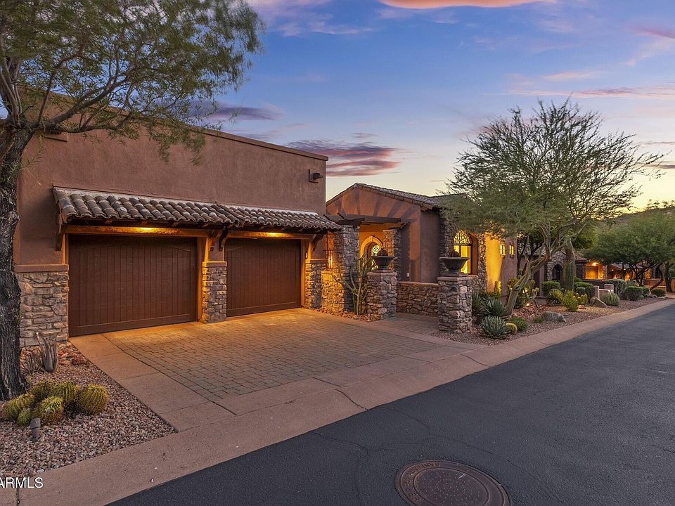 Located in the prestigious FireRock Country Club, this designer-furnished Villa blends sophistication with everyday ease. A 16' multi-panel glass wall slides open to resort-style outdoor living—private spa, outdoor fireplace, built-in BBQ, and sweeping golf course views that glow at sunset. Inside, the expansive great room centers around a chef's kitchen outfitted with Wolf and Sub-Zero appliances, double ovens, warming drawers, and exquisite finishes—perfect for cooking, connection, and entertaining. A private guest casita offers true luxury and privacy with a sitting area and walk-in closet, while the air-conditioned garage adds practical, day-to-day comfort. Turnkey, thoughtful, and designed for exceptional living.