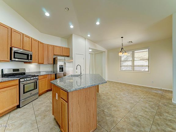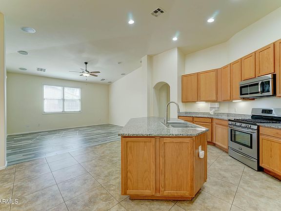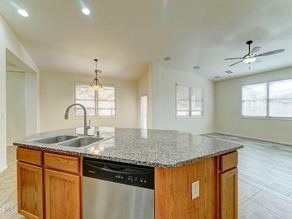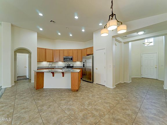 Step into the spacious foyer, which boasts soaring high ceilings that create an inviting and grand entrance to the home. Just off the foyer, you will find a versatile home office or den, complete with large windows that provide a pleasant outside view, making it an ideal space for working from home, studying, or relaxing. The thoughtfully designed split floor plan ensures maximum privacy for the main bedroom, which serves as a peaceful retreat away from the rest of the living areas. The heart of the home is the open-concept kitchen, featuring elegant granite countertops and a large kitchen island that is perfect for meal preparation, casual dining, and entertaining guests. Located in the highly sought-after Surprise Farms community, this home offers access to numerous family-friendly amenities, including nearby parks for outdoor recreation, the Prasada shopping center for convenient retail and dining options, a Costco for all your shopping needs, and the excitement of spring training baseball just a short drive away. This vibrant neighborhood combines comfort, convenience, and a strong sense of community, making it an ideal place to be home