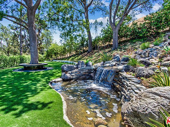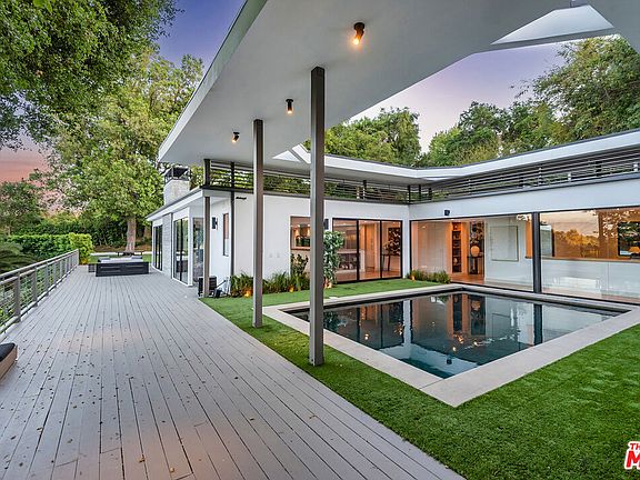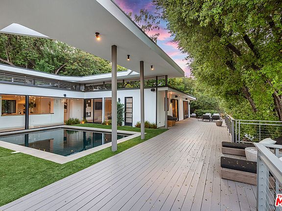 Nestled in the prestigious Royal Oaks neighborhood of Encino, this fabulous single-story meticulously renovated Mid-Century retreat offers the perfect blend of privacy, luxury, and timeless design. Accessed via a gated, long private driveway lined with trees, this stunning home boasts sweeping views of lush treetops and the valley beyond. With nearly 4,700 square feet of living space, the open floor plan seamlessly flows around a sparkling pool, creating an entertainer's dream. The home features 4 en-suite bedrooms, each with its own bath, including a grand primary suite with an attached office/gym, an expansive closet, and a spa-like bath. A romantic fireplace adds to the serene ambiance of the primary suite. The beautifully appointed kitchen, with stainless steel appliances, flows into the family room, and opens to multiple outdoor living areas, including a built-in BBQ and a cozy fire pit with custom seating. Skylights and large windows flood the space with natural light, creating an airy and inviting atmosphere. A wonderful den or sitting area unites the bedrooms, offering a perfect space to unwind. Set on over an acre of park-like grounds, this architectural gem offers unparalleled privacy, with water features, a waterfall, and a whole-home water filtration system. With its perfect flow for entertaining and tranquil oasis setting, this home is truly a must-see.