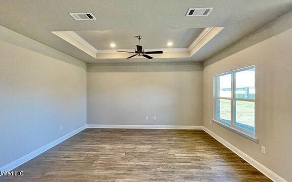 The primary bedroom is to the back of the home for privacy. The bedroom has a trey ceiling and large window allowing in natural light. The ensuite has a large walk-in closet, separate water closet, tiled shower, and garden tub. The dual sink vanity has a granite countertop and will allow for that much needed space in the morning.