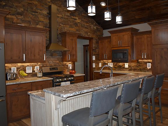 Life at the lake does not get any better! This home boasts 4 bedrooms, 4 bathrooms, a wide open floor plan with formal dining room, 4-season sun room and custom woodwork. Stone wall, custom cabinets with built-in coffee station in kitchen and vaulted ceilings. There is also a huge rec room. There are two 3-stall garages that are finished and heated and they have bonus rooms above. Outside you'll find a beautiful front porch, wonderful landscaping, a stamped paver patio with fire pit, established trees, ample lake frontage and a sprinkler system.