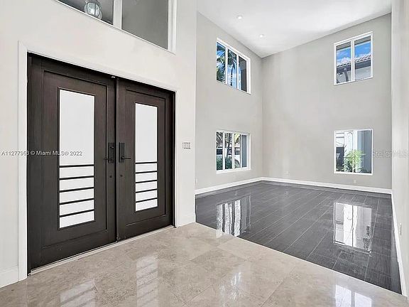 This exceptional luxury residence in Miami Lakes offers 6 bedrooms and 3.5 bathrooms, including two generous primary suites one on the main level and another upstairs. The home welcomes you with a dramatic double-height foyer, sleek modern double doors, and elegant finishes such as marble floors, rich wood flooring, and custom wrought-iron railings. The interior layout features expansive living spaces filled with natural light, a beautifully redesigned open-concept family area, and a contemporary gourmet kitchen with stone-accented breakfast bar, premium appliances, and abundant windows overlooking the pool. The main-level primary suite offers direct access to the outdoor area and includes a spa-like bathroom featuring dual vanities, a soaking tub, and an oversized shower designed to evoke a serene retreat. The upper-level primary suite offers exceptional space, abundant windows with plantation shutters, and a custom walk-in dressing room with extensive built-ins. Additional bedrooms are spacious and bright, each with modern fixtures and updated finishes. A stylish upstairs loft area overlooks the grand foyer, enhancing the home's sense of openness. Outside, the property offers a private swimming pool surrounded by lush landscaping and plenty of natural greenery, creating a calm and inviting environment perfect for relaxation or entertaining. Situated within an exclusive, highly secure gated community in Miami Lakes, this residence provides exceptional privacy and convenience. It is ideally located near the prestigious Don Shula Golf Club, the boutiques and restaurants of Main Street Miami Lakes, and top-rated schools.