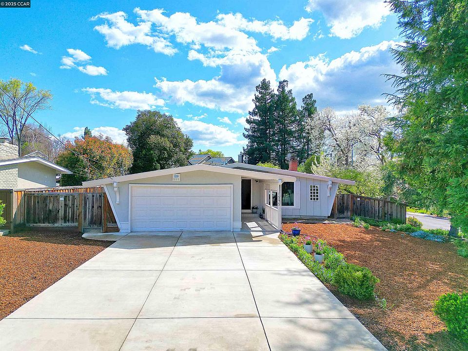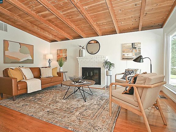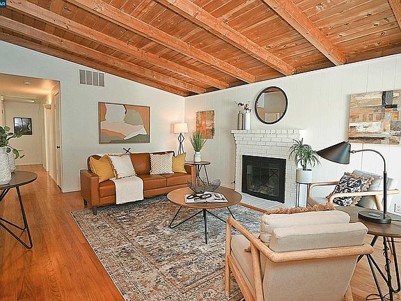 OPEN SAT & SUN 1-4PM. Stylish mid-century modern home with Eichler-inspired design in the highly sought-after Larkey Park neighborhood! Situated on a desirable corner lot, this charming single-level residence showcases stunning wood beam ceilings, beautiful hardwood floors throughout, and a cozy gas fireplace in the living room. The well-designed floor plan offers excellent living spaces, including an inviting kitchen that flows seamlessly into the dining area—perfect for gatherings. The primary suite provides direct access to a covered back deck, creating a tranquil space for relaxation. A newer HVAC system ensures year-round comfort. The spacious backyard features a patio, in ground brick firepit, and drought-resistant landscaping, offering both privacy and serenity. Beautiful newly paved driveway and tiled front walkway. Nestled on a quiet cul-de-sac with no through traffic, this home boasts an unbeatable location—just one block from Larkey Park, where you’ll find tennis courts, basketball courts, walking trails, a swim club, and more. Plus, enjoy easy access to freeways, BART, shopping, and top-rated restaurants. Don’t miss this exceptional opportunity!