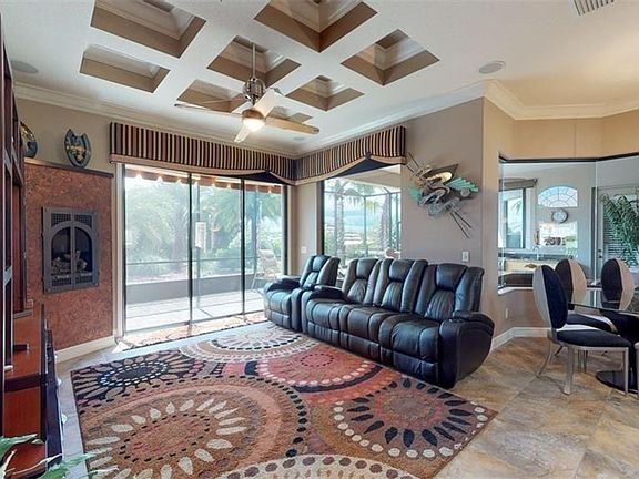 THIS GORGEOUS Furnished custom home shows like a model. Starting with the gourmet kitchen that features marble counters, glass back splash, double oven and microwave - even a center island complete with a wine cooler. The comfortable family room features a honeycomb tray ceiling and a gas fireplace. The designer lighting throughout the home is absolutely fabulous! The master bedroom suite includes a tray ceiling & two custom walk in closets. The master bath has dual designer sinks with a separate tub and a large, multi-jetted shower. This home features porcelain tile floors throughout, as well as crown molding. The sliding pocket doors open onto a large private lanai w/ an amazing outdoor kitchen which includes a grill, double sink, refrigerator and a storage area - all with granite counters. A hot tub is located on the other side of the lanai. All this and a stunning backyard complete this perfect outdoor space. Furniture subject to change with pictures, please inquire.