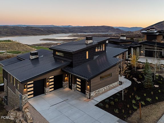 An exquisite blend of mountain modern architecture & contemporary design, this new luxury residence in the premier SkyRidge Mountain Community captures breathtaking views of the Jordanelle Reservoir, SkyRidge Golf Course, and the surrounding landscape. Every element has been artfully composed to harmonize with the natural setting, creating a statement home that is both striking and serene. Soaring ceiling heights and expansive windows fill the interior with natural light, while multiple outdoor living areas, including a covered dining terrace, 8-person hot tub, & rooftop deck, invite year-round enjoyment of the views. Enter through a sleek metal door beneath a designer chandelier into the grand living room, where refined architectural details & modern elements set the tone. The open floor plan includes a chef's kitchen with a quartzite island, Wolf range, Sub-Zero refrigerator and freezer, dual dishwashers, and a hidden walk-in pantry. A wet bar with ice maker enhances the entertaining space. The primary bedroom offers private deck access, a spa-inspired bath with a freestanding tub, dual shower, and a fully customized walk-in closet. Additional main-floor luxuries include a laundry area, ski locker room with six built-in lockers, and a stylish powder bath. The lower level offers sophisticated comfort, including a media room with surround sound, wet bar, & fitness or yoga room. Two guest bedrooms each offer en-suite ¾ baths, and a bunk room with four built-in queen bunks & an en-suite full bath. The upper level opens to a serene reading area & office or guest room with en-suite A¾ bath & access to the rooftop deck. With a heated driveway, 3-car garage, dual tankless water heaters, Ecobee thermostats, humidifier, water softener, abundant storage, & luxury finishes throughout, this custom home defines refined mountain living. Located minutes from the new Deer Valley East Village, Jordanelle Park, & 40 min. from SLC Airport.