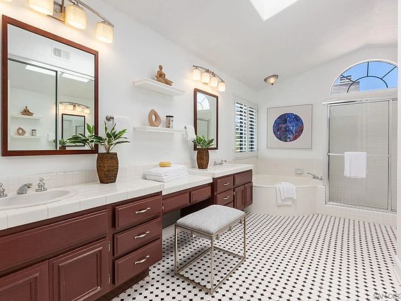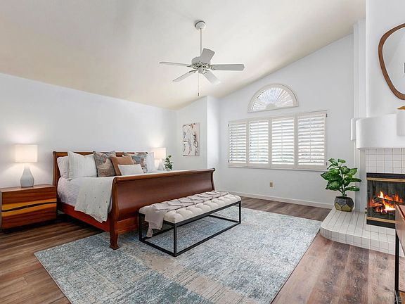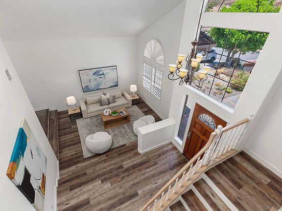 One of the most desirable locations in Sycamore Creek, nestled at the end of a double cul-de-sac, this 4-bedroom, 2.5-bathroom home offers serene mountain views and backs up to open space with a seasonal creek. Enjoy this sought after neighborhood with Premier community living and no HOA or Mello Roos fees. The beautifully upgraded kitchen features quartz countertops, stainless steel appliances, upgraded cabinets, enhanced lighting, and a sunny breakfast nook. The fully remodeled downstairs bathroom complements the large family room that opens to the pool and spa. The home has been repiped with copper piping and includes OWNED SOLAR, a garage Tesla wall car charger, and all bedrooms conveniently located on the second floor. The home's charm is further enhanced by the vaulted ceilings, a cozy fireplace in the main bedroom, a nice-sized walk-in closet, dual sinks, generous room sizes, shutters throughout, a formal dining room, pavers surrounding the pool/spa, and low-maintenance landscaping. The 3-car garage has an awesome shop/office but can still be converted to be used as a 3-car garage. Indulge in breathtaking pool and natural views from the kitchen, family room, dining area, and main bedroom. Located on a private maintenance road cul-de-sac at the end of Hidden Valley Drive, consisting of 5 homes, this property offers lots of hiking and biking trails and an easy walk to the nearby community park. This home is also located within the highly acclaimed Poway Unified School District, known for its top-rated schools. ASSUMABLE 2.375% INTEREST RATE FOR VA BUYERS.
