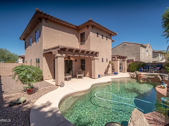 Original owner of this beautiful Palmcroft model offers 4 bedrooms plus a loft, 3 full bathrooms and a true 3-car garage. Downstairs, you're greeted by a soaring ceiling and striking custom wrought iron staircase that spans the upper loft area. There is an open den at the front of the home and a formal living and dining area with a large sliding glass door creating a perfect view of the private pool/spa. The kitchen and family room are located at the back of the home with a patio door for easy access to the pool/spa and 2 covered patios. The kitchen features an island, quartz countertops, stylish tile backsplash, stainless steel appliances and 2 custom barn doors, one encloses the pantry and the other creates privacy between the den and the hallway. Just down the hall, you'll find a full bathroom and a sizeable utility/laundry room. Located upstairs is a generous loft overlooking the downstairs entry. Double doors lead to the primary suite which includes a private bath with dual vanities, separate tub/shower and a spacious walk-in closet. Three additional bedrooms and full bathroom create the ideal space for guests or family. The backyard is perfect for relaxing or entertaining. Enjoy year-round fun in the gas-heated pool and spa, complete with a tranquil waterfall feature. Additional improvements include sunscreens and security doors at both the front and back. Legacy Parc is located just off Loop 303 in a highly desirable area. It's a mere 5-minute drive to the new La Prasada shopping center which includes a plethora of stores including Costco, Target and Home Depot, numerous dining options, a movie theatre, bowling and much more.