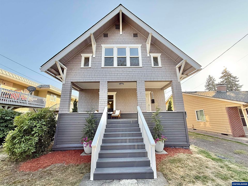 Step into timeless elegance with this Grand Historic Home, standing tall with character and charm, showcasing a freshly painted exterior of original cedar siding and shingles. A sweeping front porch welcomes you inside, where history and thoughtful updates blend seamlessly. Some windows have been upgraded to double-pane vinyl for comfort, while other original woodframed windows preserve the home’s vintage soul. Broker has ownership interest. On the main floor, the living room is anchored by a stately wood-burningreplace with its original mantel surround now highlighted by elegant custom tilework, creating a striking centerpiece. The dining room boasts two original built-ins, perfect for displaying heirlooms or serveware, while refinished hardwood floors and a crystal chandelier elevate this gathering space. The kitchen is a showpiece—brightened by grand new windows and soaring ceilings that flood the room with natural light. Here you’ll find beautiful, rich wood cabinetry that stretches extra tall, paired with sleek quartz countertops and durable LVT flooring. This space perfectly balances luxury and function, offering both style and everyday usability. The nearby sunroom added half bath with custom tilework completes the main level. The upper floor features threegenerously sized bedrooms, each with a walk-in closet, alongside a vintage black-and-white tiled bathroom with a classic clawfoot tub. A quaint original staircase ties the levels together, showcasing the craftsmanship of the home’s era. The lower level offers a spacious brand-new Great room with an egress window, a laundry area, and ample storage, blending modern convenience with historic charm. Set on an extra-deep lot with alley access, this property also holds potential for a garage or ADU. With its rare combination of preserved historic details and carefully curated updates, this home offers character, elegance, and modern livability in equal measure.