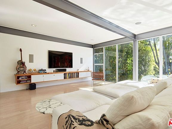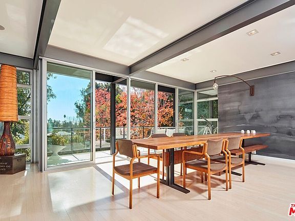 Situated on Alcima Avenue in Pacific Palisades, this tucked-back property exemplifies modernist design. Known as the "Abidi House," the residence exudes privacy and remains intact after the recent fires. Originally designed by acclaimed architect James Tyler (FAIA), former principal architect for Craig Ellwood, the home has been thoughtfully updated for contemporary living. Embracing its natural surroundings, the property features floor-to-ceiling windows in true mid-century tradition. The entry level opens with an expansive foyer framed by windows, leading to a great room that seamlessly combines living and dining areas, all oriented toward views of the backyard and pool. A covered outdoor dining terrace extends the living space, while two ensuite bedrooms and a gourmet eat-in kitchen complete this floor. The lower level offers the home's private quarters, including a serene primary suite, two additional bedrooms with a shared bath, and a flexible media room or indoor gym. Each generously sized room is thoughtfully designed to capture verdant outlooks and maintain a strong connection to the lush backyard. Outside, the centerpiece is a sparkling pool with a built-in spa, contributing to the property's calm, retreat-like atmosphere. Owners have completed all necessary remediation work resulting from the fires and will provide documentation to confirm.