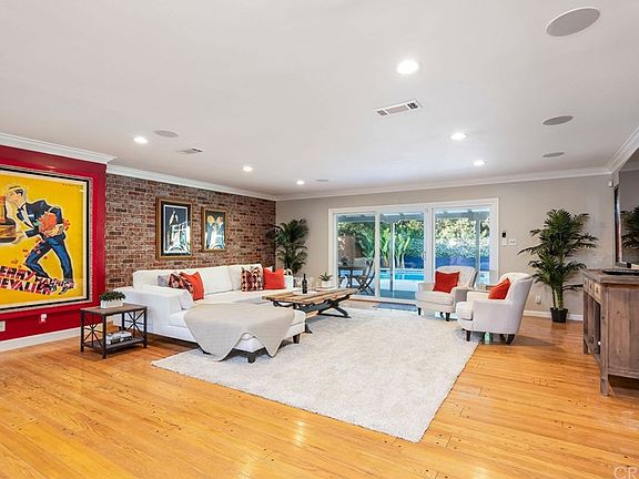 Located in the hills of Sherman Oaks South of the Blvd lies this single story, 4 bed, 3 bath home in Royal Woods. Behind exclusive gates and surrounded by trees, this landscaped home is not one to miss! Entering this 2,570 Sqft home, you are welcomed by an inviting red door and open floor plan that gives off a trendy New York loft-style feel. With an abundance of space, eye-catching accent wall, and access to the backyard, the living area is made to entertain. Flowing effortlessly to one side is a dining area perfect for gatherings with family. A kitchen with island follows with stainless steel appliances, cabinetry, and granite countertops. Plantation windows allow for an abundance of natural light that illuminates the hardwood floors. 3 bedrooms and 2 bathrooms are a must but the main event is the master suite. Featuring an accent wall, private access to the backyard, walk-in closet with vanity and master bath with a double sink vanity, Toto toilet, shower and tub to soak in, this is the ultimate retreat! A bonus room with full bath is located towards the back of the home and is perfect for a playroom, office, or even media room! The backyard includes a patio, pool, kids playground, cabana for lounging and outdoor bathroom with toilet and shower! Additional features include in-ceiling speakers for indoor/outdoor surround sound, dimmable recessed lighting, and attached 2 car garage with extra storage. Conveniently located near the 101 & 405 fwys, your dream home awaits!