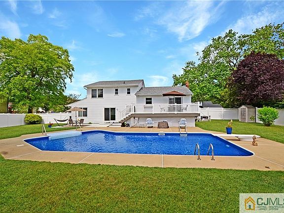 Welcome to this charming open-concept split-level home in the sought-after Feathertree neighborhood of North Dover, Toms River. This quiet, enclosed area has minimal traffic due to its cul-de-sac layout. The curb appeal and professional landscaping catch your eye before entering to find a modern herringbone tile floor in the foyer, with access to the upstairs living room, basement, or spacious family room. The family room offers a sliding glass door to the patio, a Bose surround sound system, recessed lighting, access to a heated garage, and a nearby half bathroom. The living room features hardwood floors and a large window for natural light. The open-concept kitchen has a glass door to the outdoor deck, a new refrigerator and dishwasher (2023), garbage disposal, and a gas fireplace. Upstairs, the hardwood continues, leading to three bedrooms and two full renovated bathrooms. The master bedroom includes a walk-in closet, an additional closet, and a remodeled full bath. The partially finished basement is ideal for a rec room, with plenty of extra storage and a 2nd refrigerator included. The backyard is perfect for entertaining with an in-ground pool, trex deck, concrete patio, large lawn and 16X20' shed. Other features include a New Roof (2019), Newer Anderson Windows, Tankless Water Heater (2019), Pool Liner (2023), Gutter Guards (2022), and new ceiling fans in all bedrooms (2023), LG Brand Washer & Dryer, NEST temperature control thermostat. Situated on over a 1/3 acre lot, the home is near major highways, Castle Park, Bay Lea Golf Course, Shopping, Restaurants, Toms River High School, and the Jersey Shore. There are too many amazing features to list. Make this your home before it's gone! Showings start Thursday June 20th. Grass digitally enhanced.