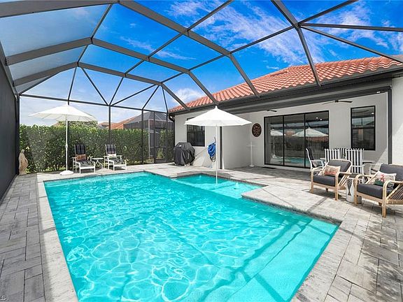 Experience refined living in this immaculate and elegantly appointed Marsala model, offering three bedrooms plus a den (optional fourth bedroom) and three full bathrooms. Perfectly situated on a premium homesite, this residence captures stunning lake and nature preserve views, creating a serene backdrop for the most dramatic evening sunsets. Step outside to your private outdoor oasis featuring one of the largest lanais in the neighborhood with an impressive 30 feet deep cage with no-see-um screens. The spectacular 2023 custom-designed pool is the centerpiece, complete with four soothing hydrotherapy body jets and relaxing sun shelf. Inside, the gourmet kitchen is a chef’s delight with an oversized breakfast bar, granite countertops, newer premium stainless-steel appliances, stylish dining chandelier, and spacious walk-in pantry. The open-concept layout flows effortlessly into the great room, creating a bright, inviting space ideal for gatherings. The luxurious primary suite offers sweeping lake and preserve views, complemented by a spa-inspired bathroom featuring dual vanities, large walk-in shower, soaking tub, private water closet, and dual walk-in closets. Two additional guest rooms, including a private en-suite with full bathroom, ensure comfort and privacy for guests. Throughout the home, meticulous upgrades elevate every detail, from upgraded interior door hardware and hinges to elegant crown molding, recessed lighting, and stylish tile flooring throughout (no carpet). Valuable upgrades include a Culligan water filtration system, whole-house surge protector, upgraded electrical for generator hook-up, wall-mounted televisions, window blinds throughout, seven ceiling fans, and a well-appointed laundry facility. Additional premium features include hurricane shutters for all windows and doors, a durable epoxy-coated garage floor, heavy-duty storage shelving with 800-pound capacity, and an elegant brick paver driveway and entryway. Artesia is one of Naples sought-after upscale gated communities, known for its luxurious amenities and active lifestyle. The definition of peaceful living, Artesia is along the southern and western edges of Rookery Bay, a protected national estuarine reserve, where the community enjoys a rare kind of serenity surrounded by peaceful nature. Just minutes from beaches of Naples and Marco Island, Artesia offers a boutique setting where natural beauty and convenience meet. The modern clubhouse hosts lively community social events and features a resort-style pool, three pickleball courts, two bocce ball courts, billiards, fully equipped gym and movie theater. Residents also enjoy exercise and craft classes, as well as beautiful lakeside walking path and dog parks. Short drive from downtown Naples and Marco Island, this home offers the best of both worlds like a peaceful, luxurious community and proximity to vibrant local attractions. HOA fee includes cable/internet. No CDD fee. Click link for 3D tour and floor plan.