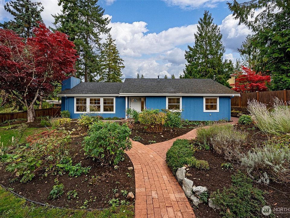 Wonderfully charming rambler in a peaceful, private, oasis type setting. Three bedrooms, with en suite in primary. Beautiful, sparkling new kitchen, with new cabinets, countertop, range and microwave. Home is completely freshly painted throughout. Vaulted ceilings with tons of sunlight. Large, fully fenced, beautifully maintained, level, garden type yard, with amazing patio in your back yard, along with outbuilding. Large two car garage, nestled around back.   Easy access to shops, dining and freeways. Come make this gem your own!