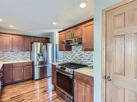 Stunning Remodeled Stonegate Home with 3-Car Garage - This beautifully updated home features newer hardwood floors, designer crown molding, and a newer interior/exterior paint scheme. The exterior is frame with composite siding & brick. The renovated kitchen boasts updated cabinets, quartz countertops, a stylish backsplash, and newer stainless-steel appliances with a built-in wine cooler. The stove is gas & the self-cleaning oven has an air fryer & convection features. French doors in the dining room lead to a unique, lighted stone patio—one-of-a-kind in Stonegate. Second patio is included. Enjoy cozy evenings in the family room with a Mendota gas fireplace, antique barnwood mantel, and custom tile. The main floor includes a study, while upstairs offers a redesigned primary bath with a custom walk-in closet and an updated guest bath. Brand-new carpet graces the second floor and finished basement. The basement includes a wet bar, mini fridge, and 3/4 bath. Additional upgrades: energy-efficient tinted windows, wired security, wi-fi connected sprinkler system, updated garage door mechanics and new sump pump system. Cooling system is a Whole House Fan which works well as an air conditioner. Professionally cleaned. Community amenities: clubhouse, pools, tennis courts, basketball, pickleball, volleyball, and more. Close to restaurants, top-rated schools, bus stop, light rail, I-25, and E-470. Move in Ready. Virtually Staged. New Roof Coming Soon!