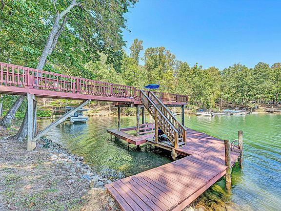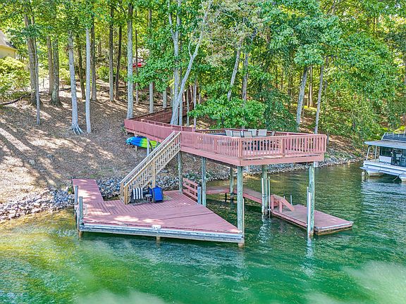Custom built waterfront home ideally situated in a fantastic lake location by both road & water. Tucked in a deep water cove near channel marker C-3, boasting stunning lake, mountain & sunrise views across the highly desirable Cradock Creek section of Smith Mountain Lake. Being sold Turn-key; the entry level features a large kitchen, dining area & great room w/ vaulted ceiling, the primary lakeside bedroom & a full bathroom. Upstairs, an open loft overlooking the great room leads to two guest bedrooms & a full guest bathroom. The lower level offers a full 2nd kitchen, a lakeside family room, a full guest bathroom, laundry, & a bonus room that is currently decorated as a 4th bedroom. Lakeside decks are accessible from both the great room & family room. A boardwalk connects the lower deck to the single-slip dock, which includes a covered boat slip, party deck, & floater. The property also features a nice fenced pet area just off the side of the home & a large circular driveway with ample parking. Established vacation rental home. A complete Smith Mountain Lake waterfront package, perfect for full-time living or a vacation retreat.