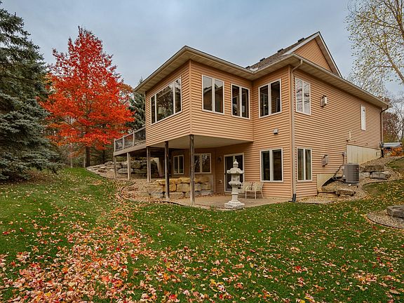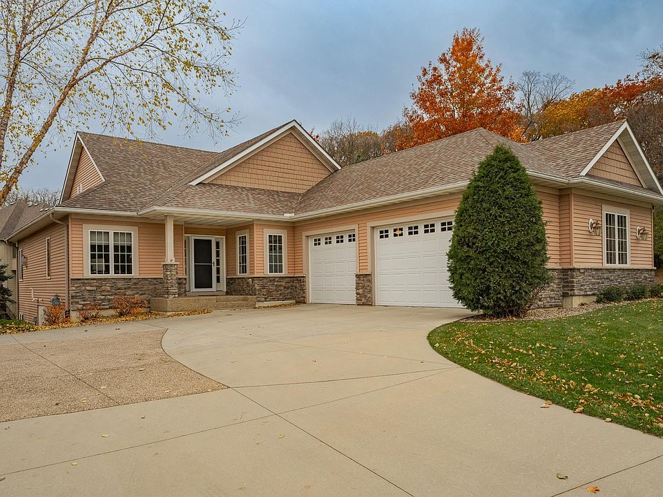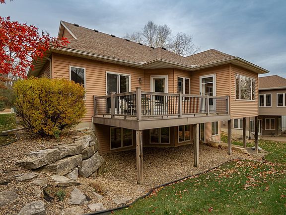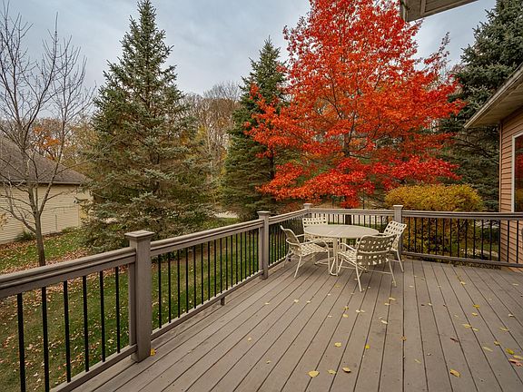 Beautiful walkout rambler nestled on a wooded cul-de-sac lot. This home offers exceptional main level living with an office, laundry room, sunroom, and spacious primary suite. Features include cherry cabinets and doors, Brazilian cherry hardwood floors, and two cozy gas fireplaces. The lower level provides a large storage room, two additional bedrooms, and a 3/4 bath. Enjoy outdoor living on the composite deck, plus the convenience of an in-ground sprinkler system and a 3-car garage. Fantastic location!