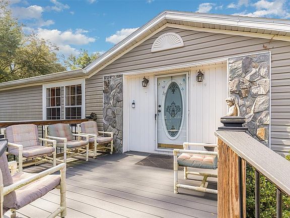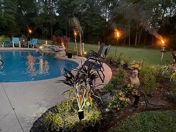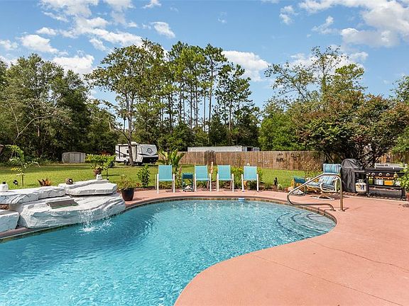 A hidden gem POOL HOME, adjoining the Gothe State Forest on almost an acre lot! You'll be astonished at all that comes with this home, especially at this price, looking for a quick sale. From the moment you arrive the oversized lot and vinyl drive-thru gate sets the tone for exceptional privacy. The expansive property offers ample space for hosting overnight guests, complete with camper and generator hookups. Oversized front deck welcomes you into this 3 bed/2 bath split floorplan. Beautiful plank flooring throughout with OPEN CONCEPT LIVING, along with a large private dining area. Enjoy eating at your breakfast bar overlooking the bright and light kitchen with ALL APPLIANCES included & kitchen floor recently redone. Solid white cabinets with abundant storage and counter space. All faucets throughout home replaced. The vaulted ceiling makes this home feel exceptionally spacious with 2 bedrooms and private bath at front of home. Inside laundry room with washer and dryer. Large primary bedroom located near back of home with double size walk-in closet. You're going to LOVE YOUR EN-SUITE BATH. Double sinks with decorative lighting, linen closet, and large walk-in shower with rain-head. The grand finale is the incredible backyard retreat designed for total relaxation and entertaining. Outdoor living at its finest with a back covered patio and concrete floor extending length of home, including a spacious screened lanai. Your family and friends can stay overnight with the huge backyard area equipped for a camper hookup and private fenced backyard. You will enjoy sharing your tropical oasis with the amazing SALTWATER POOL with lighting and waterfall. Landscaping surrounds your pool or sit around your firepit to enjoy the sounds of nature backing to the State Forest. 2 outdoor sheds included and new back fence. A/C motor just replaced. Just minutes from the World Equestrian Center, Rainbow River and Ocala's shopping/dining. This one is priced to sell fast, so call for a showing now.