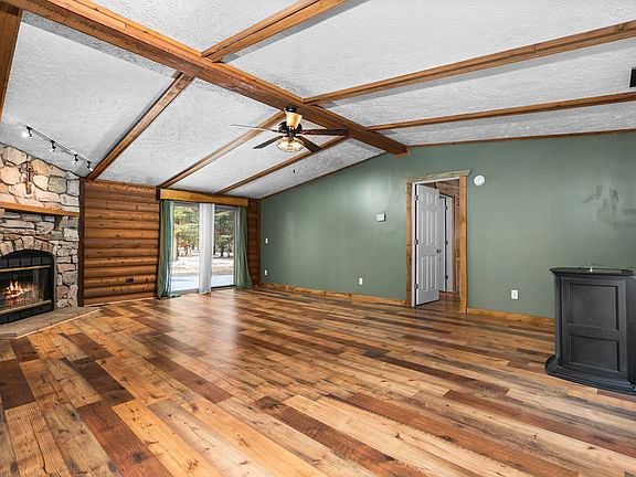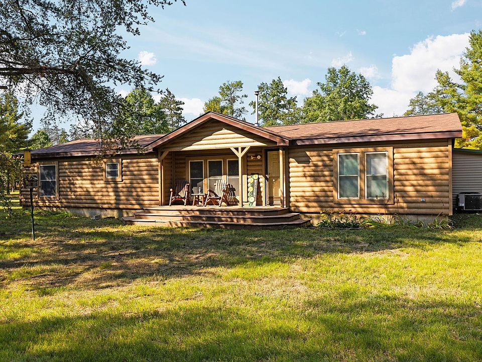 Step into easy main-floor living with this 3 bed/2 bath ranch-style log home, perfectly blending rustic character with modern comfort. The open layout is bright and inviting, featuring vaulted, beamed ceilings, and a wall of windows. A stone fireplace anchors the living and dining area, while the spacious kitchen shows off ample cabinetry, a striking hexagon tile backsplash, and a large dining peninsula that makes cooking, gathering, and entertaining a breeze. Two roomy guest bedrooms, a full bath, and a dedicated laundry are tucked down one hallway, while the private primary suite sits opposite for maximum retreat. Here you’ll find a generous walk-in closet and an en suite bath with dual sinks, a shower built for two, and a soaking tub that begs you to unwind. A breezeway connects the home to an impressive 40x20 pole building and garage, ensuring you and your vehicles stay sheltered year-round, with extra room for all the toys. Nestled on nearly two wooded acres, this property offers the perfect mix of privacy, space, and warmth. Clean, move-in ready, and waiting for you to call it home.
