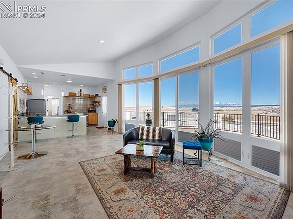 Custom contemporary home on 5 acres with incredible views of Pikes Peak and the pine covered bluffs across the street* Great open floor plan creating a spacious feel that is light and bright* This 2 bedroom, 2 bath, office and 2 car garage home offers 360 degree views, a 5'+ high crawl space under the footprint of the home, horse barn, storage, fully fenced, tall RV or horse trailer covered storage* Luxury vinyl tile throughout for easy care, modern marble and tile accents in the baths and kitchen, ceiling fans, stainless appliances, floor to ceiling windows featuring AMAZING views of Pikes Peak and the tree lined bluffs across the street* Master bath pre plumbed for soaking tub* Easy access on the paved roads, Atlas Loop is a county maintained road* Minutes to Homestead Ranch Regional Park (450+ acres) offering fishing in the large pond, miles of trails, extensive covered picnic facilities, play ground, soccer field and restrooms* Antler Creek Golf course is close by as well as Meadow Lake Airport for recreational pilots* Inviting subdivision with newer homes* NO mobile or modular homes allowed* There are covenants but NO HOA* ILC and well permit are in the documents section (click on the icon to open them).