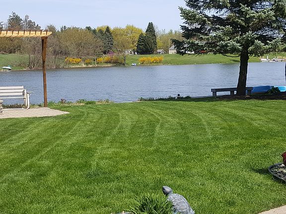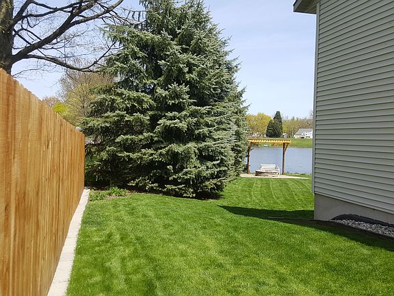Fantastic private setting on Cottonwood Lake. Open floor plan, walkout ranch with brick and vinyl exterior.(Builders home that lived here 15 years). Professionally landscaped yard with underground sprinkling. Custom built stone fire pit and patio at the waters edge. Built in dock with bench. Well maintained home has cathedral ceilings in main living area, sun room and master bedroom. Main floor laundry, deck and finished rec room. Excellent family home has three bedrooms plus fourth bedroom partially finished. Three bathrooms. Master bedroom has private bath and walk-in closet. Oversize 2 1/2 stall garage, finished with service door.