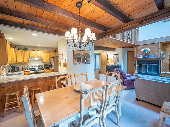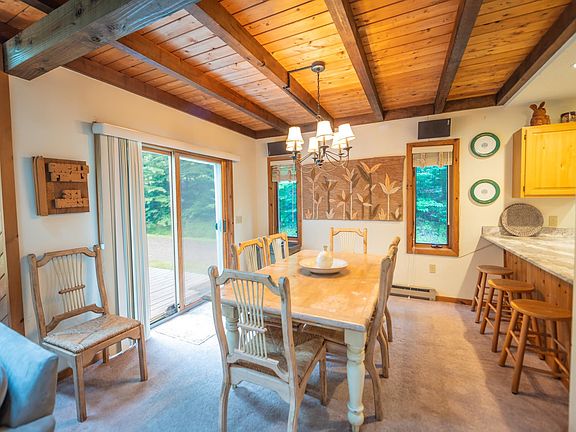 Open to offers! Beautiful woodsy updated Suntec townhome just down from the base of the Mount Snow ski resort. This spacious 4 bedroom townhome sits about a mile south of Mount Snow, with direct access to snowmobile trails, and easy access to the nearby village of Wilmington and lakes. The unit has a large renovated open concept floor plan with vaulted great room, rustic wood paneling, passive solar exposure, a wood burning fireplace and stone hearth, large dining room with exposed beams, newly renovated kitchen with updated counters, cabinets, and stainless appliances, breakfast bar, large mudroom entry with storage for gear, main floor floor bath, hot tub, and sauna, which can be converted to a bonus room as outdoor hot tubs are now allowed, a second floor primary suite with vaulted ceiling and walk-in closet, two large guest bedrooms and a full guest bath, and a third floor large family room perfect for overflow sleeping with enormous owner storage area if renting. The style and location are perfect for strong rentability. Suntec has never had a special assessment so budgeting is easy, and amenities include building maintenance, recently redone roofs, an outdoor swimming pool, tennis court, direct shuttle service to Mount Snow, direct snowmobile trail access, great parking space, landscaping, and snow removal.