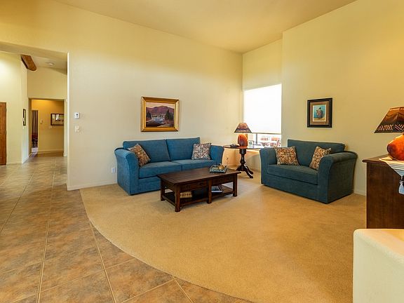 Large ceilings throughout the home. The front entry has a beautiful floral tile design to greet you. Features include two separate living spaces and a formal dining room with western views. Kiva fireplace in the great room and sliding doors throughout the home offer easy access to the outdoor living areas. The fourth bedroom is a large suite with an ensuite bath. There is an office space that could be used as a fifth bedroom.