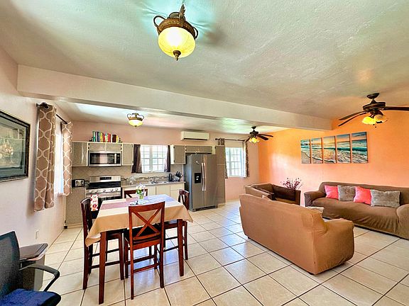 Two bedroom/one bath modern, furnished, fully air conditioned home features Sol-Ark state of the art solar energy system and WAPA connection, generator, professional building plan drawing for upper level 3 bedroom/2 bath residence with 2 car park parking area (rebar framework installed). Home interior features an open-concept kitchen/living room furnished with like-new appliances, flat screen Smart TVs, mud room, guest bedroom & master bedroom (features walk-in closet & office area.) Large gallery with lounge area, outdoor patio furniture & grill, 2 private covered car ports, laundry room, toolshed, on a large parcel with a near flat topography perfect for a swimming pool.