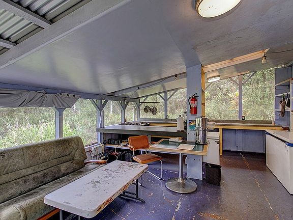 The main house, built on post and pier, spans approximately 624 sf and comprises two bedrooms, a bathroom with an outdoor shower, and a kitchen/living room area, with plenty of storage space. The living room area features custom window seats with screened windows and abundant natural lighting and excellent air flow. The property also has 360 sf outbuilding, with sink, washer and propane dryer. This building could be used for additional living space, workshop or storage. Additionally, there is an outhouse with a toilet and the outdoor shower. The water catchment is cement cinder block. Property is being sold AS IS with furnishings included in sale.